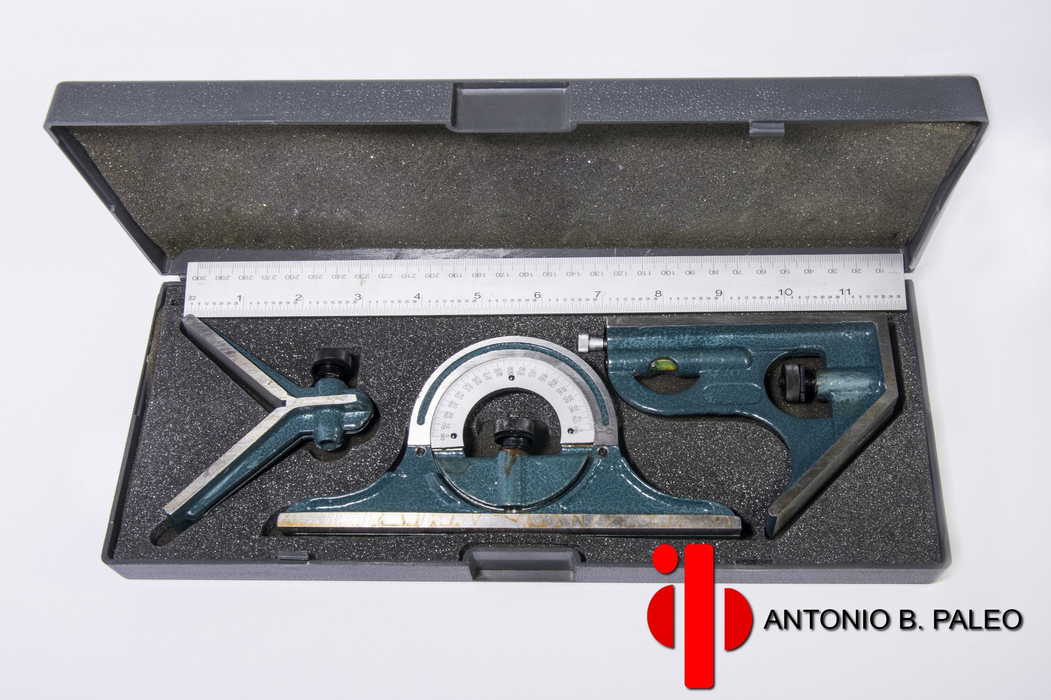 Regla grabada 300 mm. con trasportador 0° a 180° , nivel escuadra busca centros y aguja de trazar.